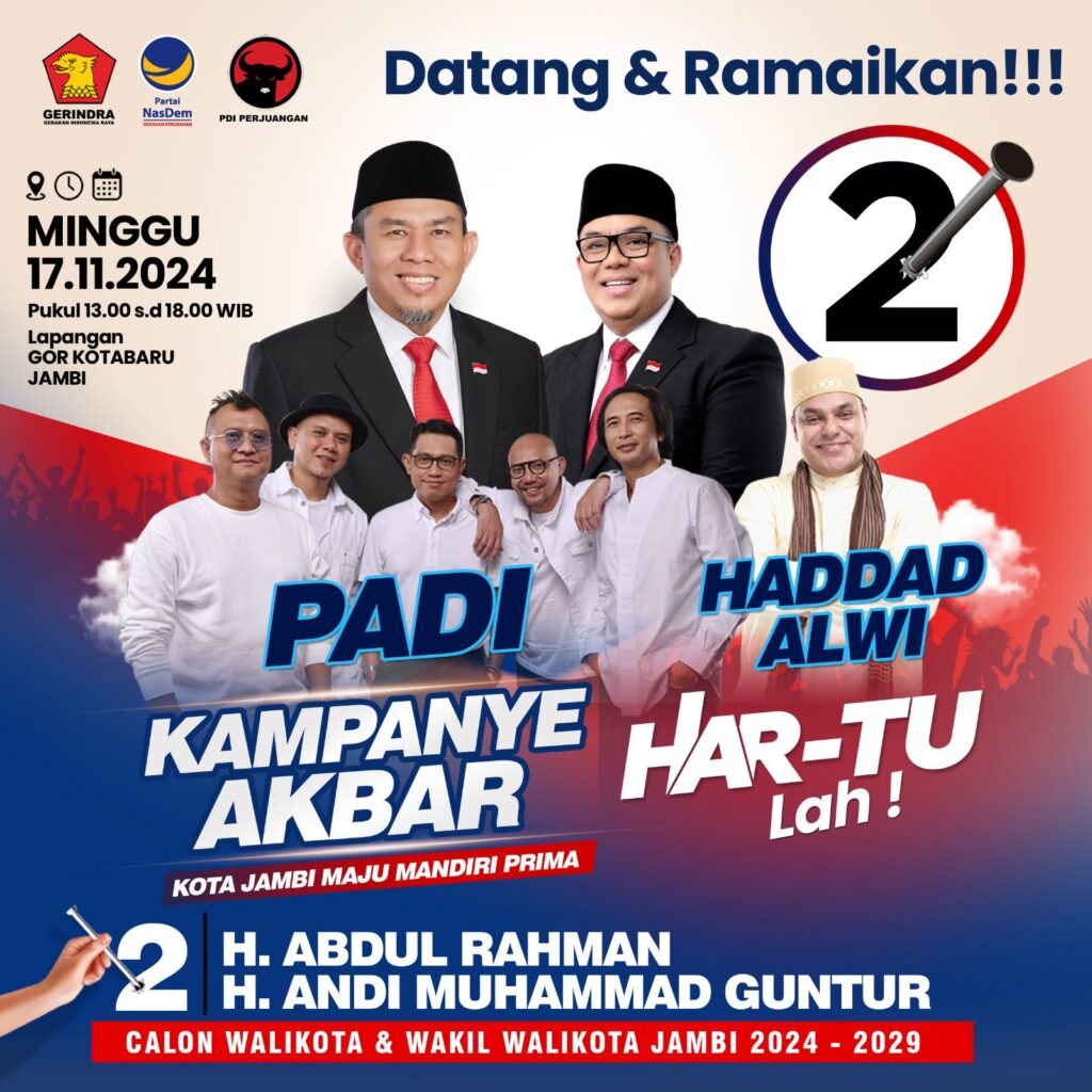 “Kami mengajak seluruh masyarakat Kota Jambi untuk hadir dan meramaikan kampanye akbar pada hari Minggu, 17 November 2024, di GOR Kota Baru. Kami akan menghadirkan dua artis, Padi Reborn dan Hadad Alwi, untuk menghibur kita semua,” ajak H. Abdul Rahman.